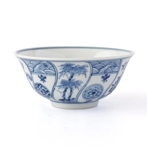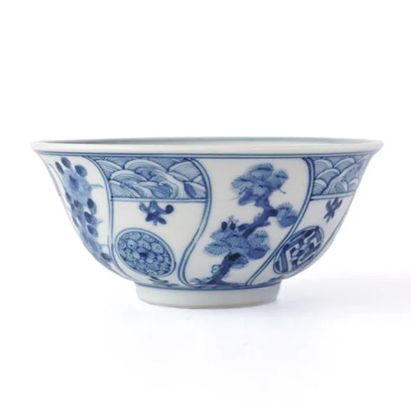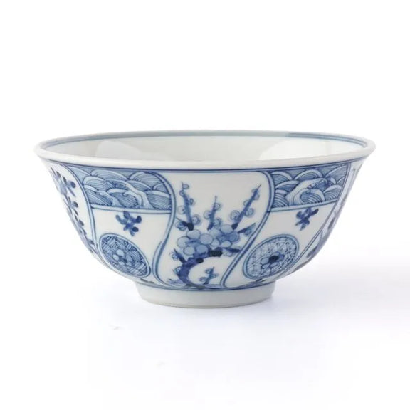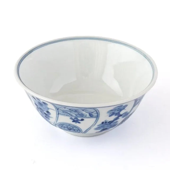 [IMPERIAL HOUSEHOLD PURVEYOR KILN] KUTANI WARE RICE BOWL (SMALL) – BLUE & WHITE AUSPICIOUS TREE AND FLOWER PATTERN BY CHOZA YAMAMOTO