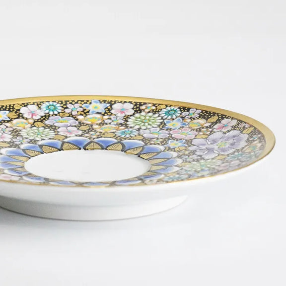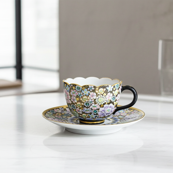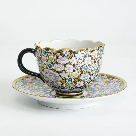 JAPANESE KUTANI CUP & SAUCER SET – HANA-ZUME FLORAL GOLD DECORATION BY ARTIST TAKAFUMI TAKA