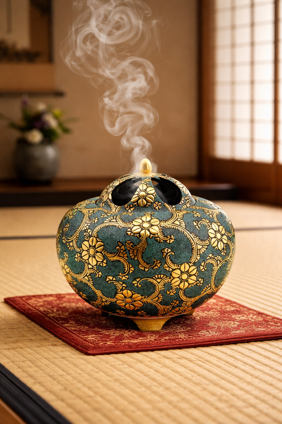 KINGYOKU NAKADA KUTANI INCENSE BURNER – "WHIRL PATTERN BLUE DOTS WITH DOUBLE CLEMATIS ARABESQUE"