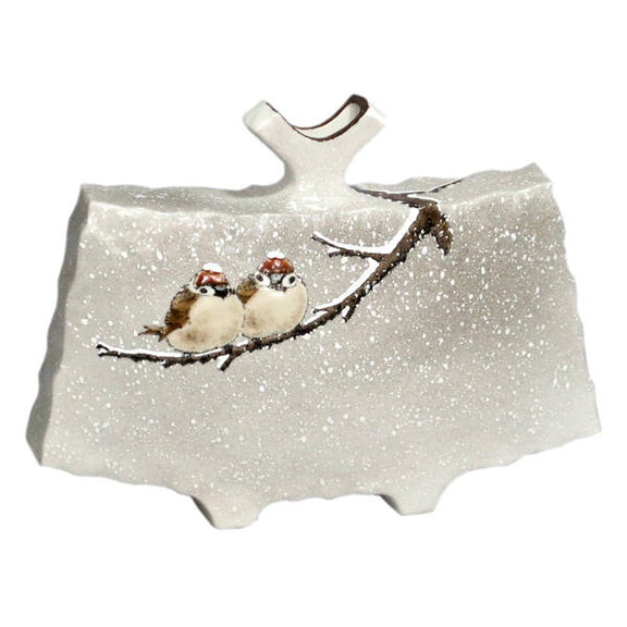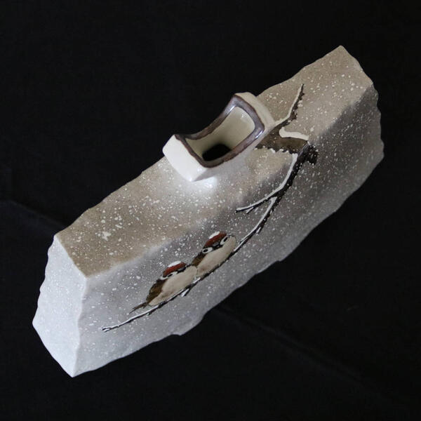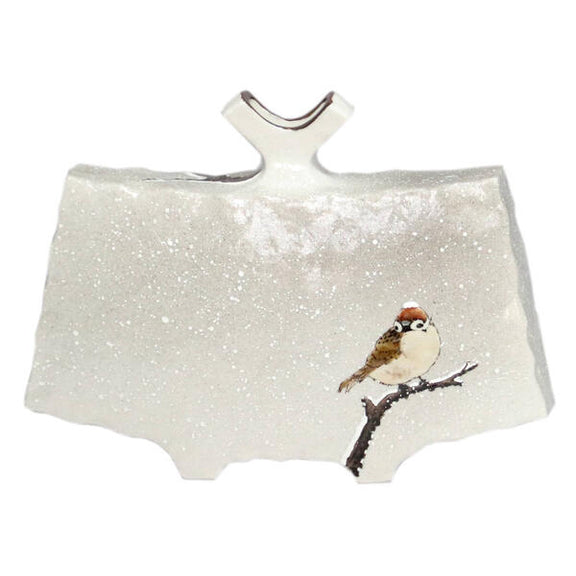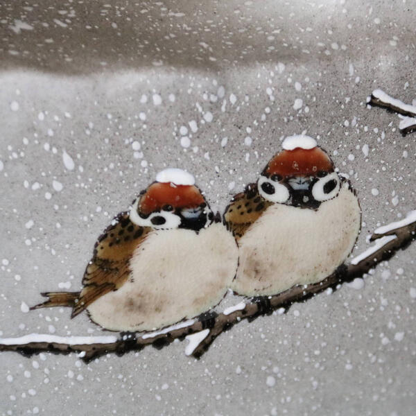 This vase is created by Toshito Nakamura, a master craftsman and Certified Traditional Artisan, often regarded as the leading Kutani artist for depicting sparrows. The work beautifully portrays two sparrows gently nestled together, their heads lightly dusted with snow, evoking warmth, intimacy, and seasonal elegance.