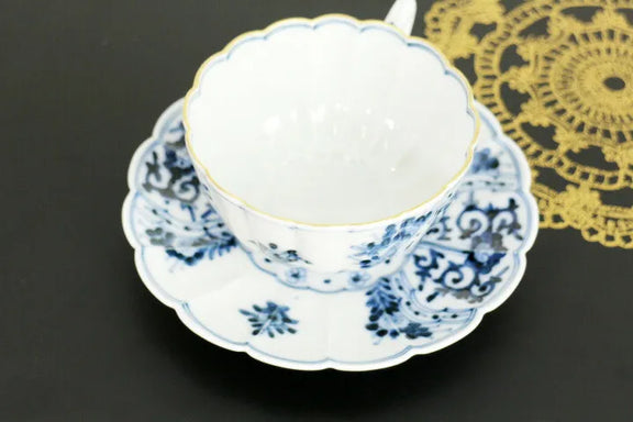 KUTANI WARE CUP & SAUCER – BLUE AND WHITE AUSPICIOUS DESIGN [IMPERIAL HOUSEHOLD PURVEYOR KILN] BY CHOZA YAMAMOTO