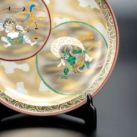 KUTANI WARE DECORATIVE PLATE – FUJIN & RAIJIN BY TAKA TOSHIFUMI (WITH STAND, WOODEN BOX WITH CORD)