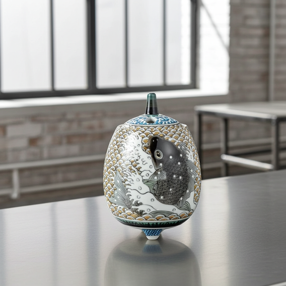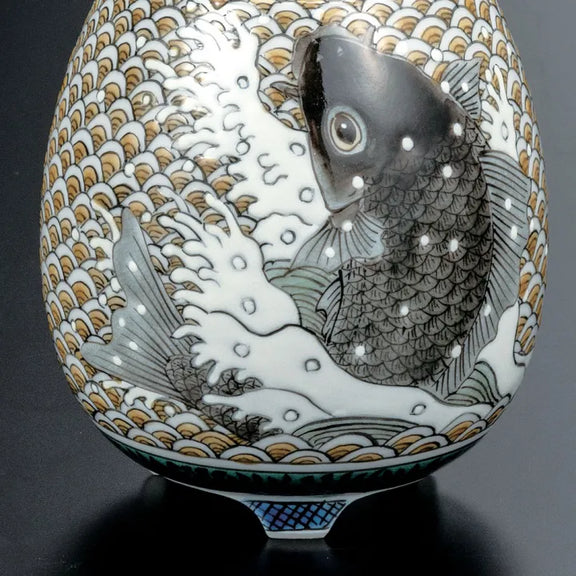 KUTANI WARE INCENSE BURNER – NOBORI KOI (CARP CLIMBING THE WATERFALL) BY YOSHINORI FUKUDA