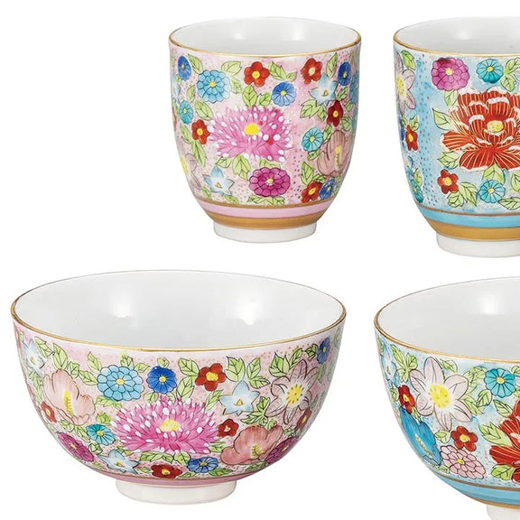 KUTANI WARE SAKE CUP & TEA CUP SET – HON-KIN HANA-TSUME DESIGN BY TAISHI KILN (GIFT BOX INCLUDED)