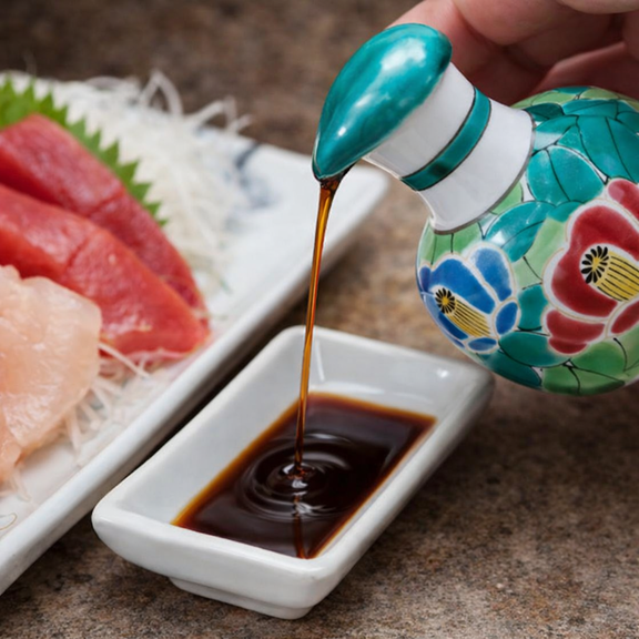 KUTANI WARE SOY SAUCE DISPENSER (SMALL)KYO-SAZANKA DESIGN, BIZAN KILN, JAPANESE CERAMIC SAUCE CONTAINER