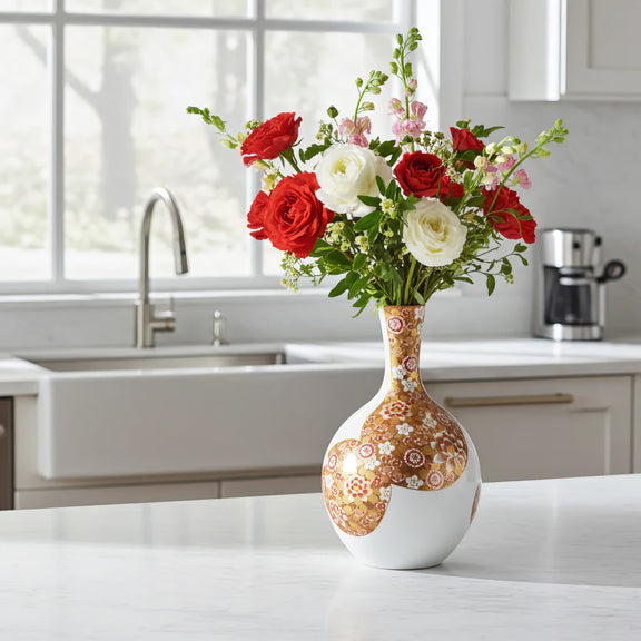 KUTANI WARE VASE – AKAE & GOLD HANA-ZUME PATTERN BY TAKA TOSHIFUMI (WOODEN BOX WITH CORD)