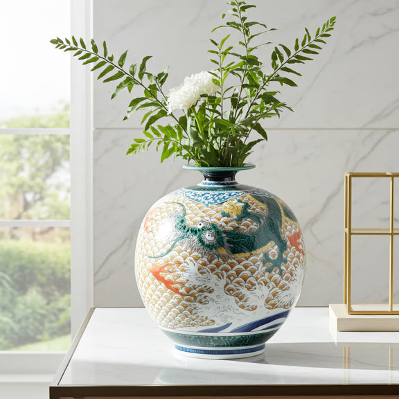 KUTANI WARE VASE “AOTE RYŪJIN” (BLUE-GLAZED DRAGON GOD) HAND-PAINTED BY YOSHINORI FUKUDA | WITH PAULOWNIA WOOD BOX (WITH RIBBON THREADING)