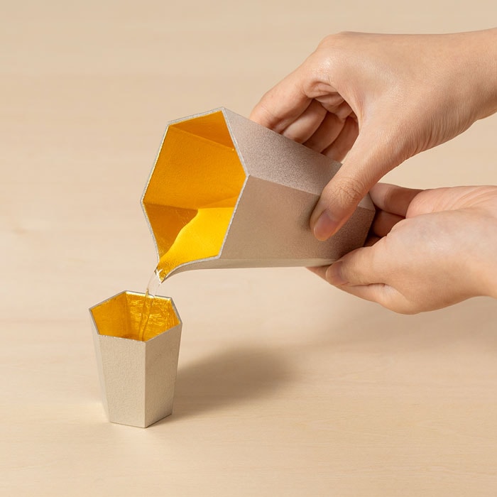 The name “Roku” (六) comes from its geometric, straight-edged hexagonal form, creating a stylish and contemporary impression. The gold leaf interior beautifully reflects the sake, enhancing its color and creating a luxurious drinking experience.